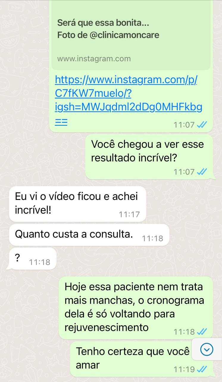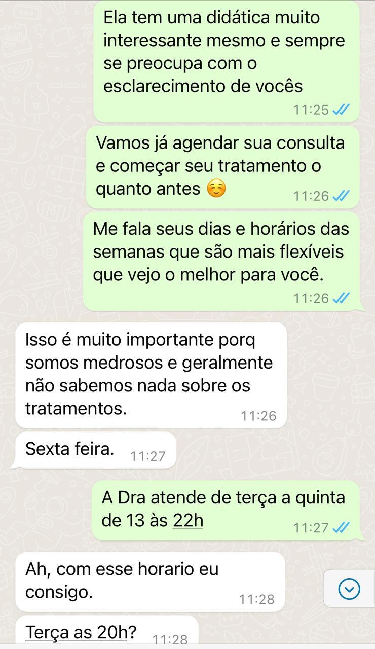 Veja na prática como nossas estratégias de comunicação no WhatsApp podem transformar suas interações com pacientes. Estes exemplos ilustram técnicas simples e eficazes para engajar, construir confiança e fechar consultas com mais facilidade. Aplicáveis desde o primeiro contato até o fechamento da consulta.